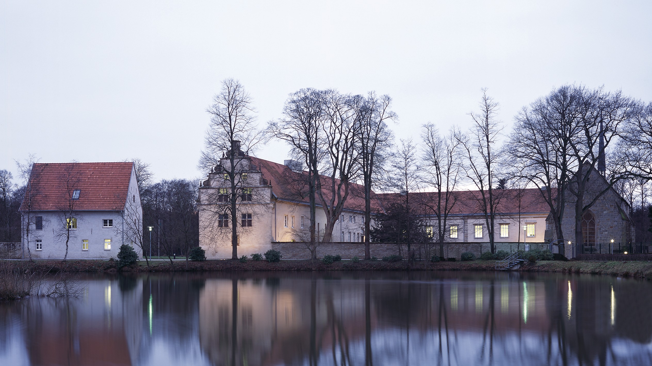 Die heutige Nutzung basiert auf einer Restaurierung und Umnutzung, die weniger auf Rekonstruktion als auf Sicherung, Lesbarkeit der Zeitschichten und funktionale Ertüchtigung zielte. Beschädigte und überformte Bereiche wurden konsolidiert, historische Spuren bewusst nicht „glatt“ restauriert, sondern in ihrem Bestand mitgeführt. Neue Anforderungen (Erschließung, Barrierearmut, Haustechnik) wurden durch klar zeitgenössische Eingriffe gelöst, darunter ein neues Treppenhaus als Erschließungskern. Auch die Außenräume wurden mitgedacht: Fassadenflächen wurden vereinheitlicht, Regenwasserführung und Hofgestaltung so organisiert, dass sie den Umgang mit der Gräfte sichtbar machen und unterschiedliche Höhenniveaus verbinden.