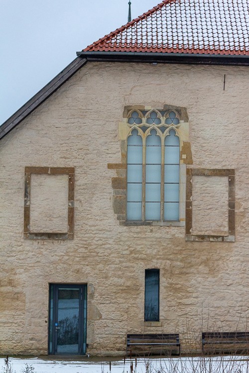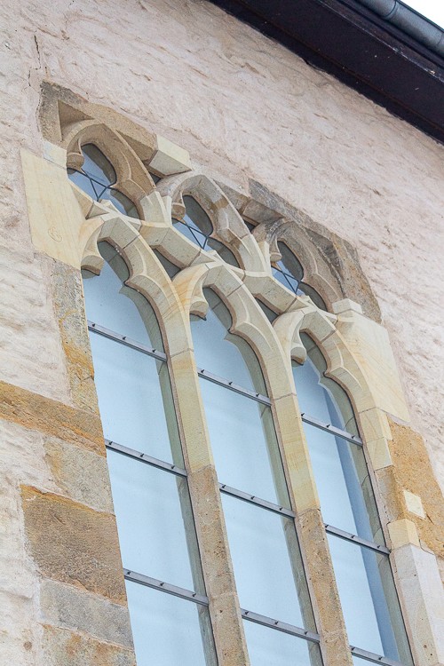 Kaum zu übersehen ist auch das gothische Maßwerkfenster am südlichen Ende des Westflügels. In diesem wurde eine ganz bestimme geometrische Form genutzt die aus drei sich gleich überschneidenden Kreisen besteht.