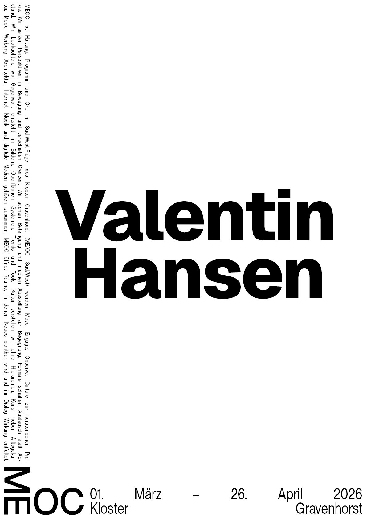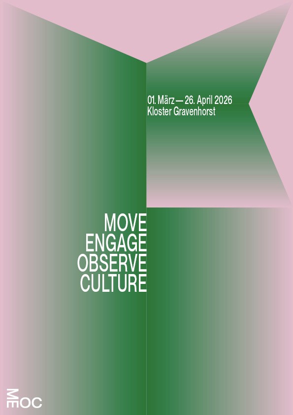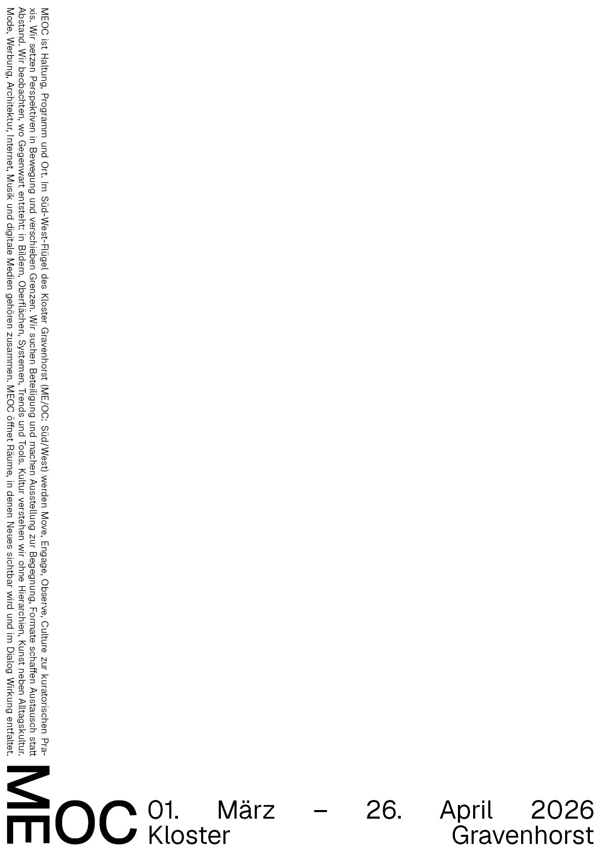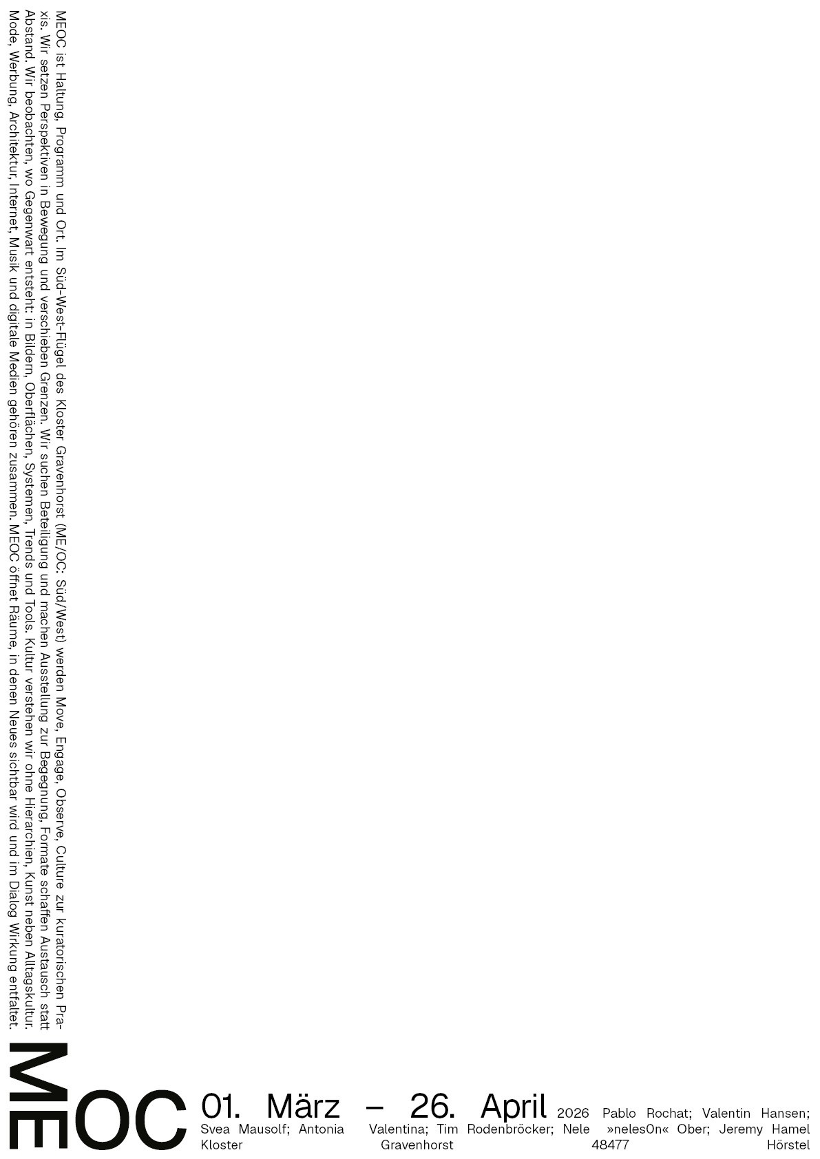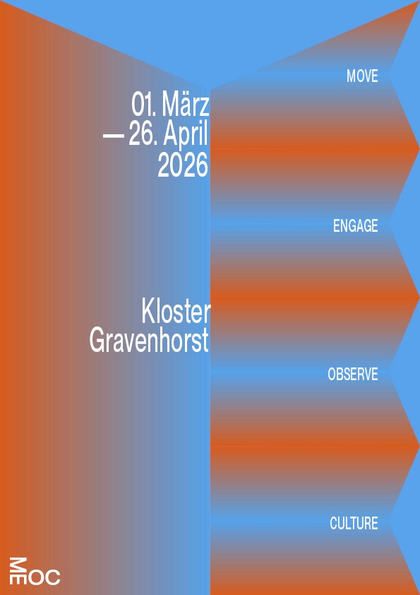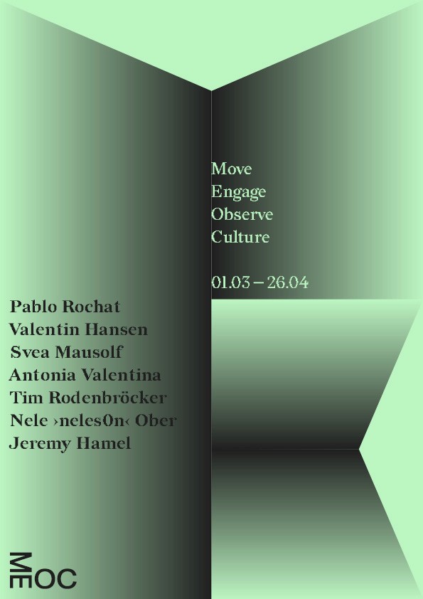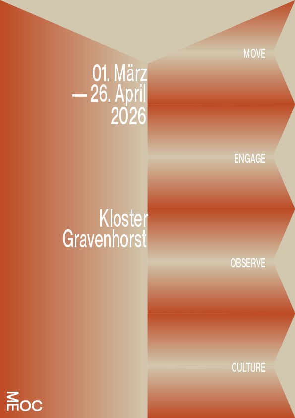 Die Namen und Logo Idee von MEOC für Latein Süd/West und als Akronym für das Leitmotiv »Move Engage Observe Culture« fand ich sehr stark und wollte ich unbedingt weiter ausarbeiten. Nachdem ich versuchte das Logo weiterzuentwickeln merkte ich, dass die Reduzierung auf das wesentliche die beste Entscheidung ist. Die im 90° aufeinander treffende Glyphen paare sagte eigentlich schon alles was gesagt werden musste. Die bloße Anordnung der Schrift in diesem Winkel erinnerte mich wieder zurück an die Schriftbänder an den Außenkanten der Grabplatten. Dabei kam mir die Idee ausgehend von dem Logo, Textabsätze in der jeweiligen Orientierung der Glyphen paare an den kompletten Außenkanten des Formats entlang zu setzten. Das Logo Bindeglied und Ausgangspunkt zugleich, trotzdem übernahm es dem Raum nicht Visuell, sondern eröffnete eine völlig neue, prägnant gerahmte Spielfläche.