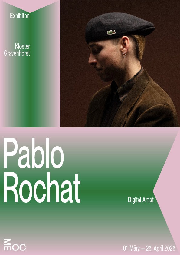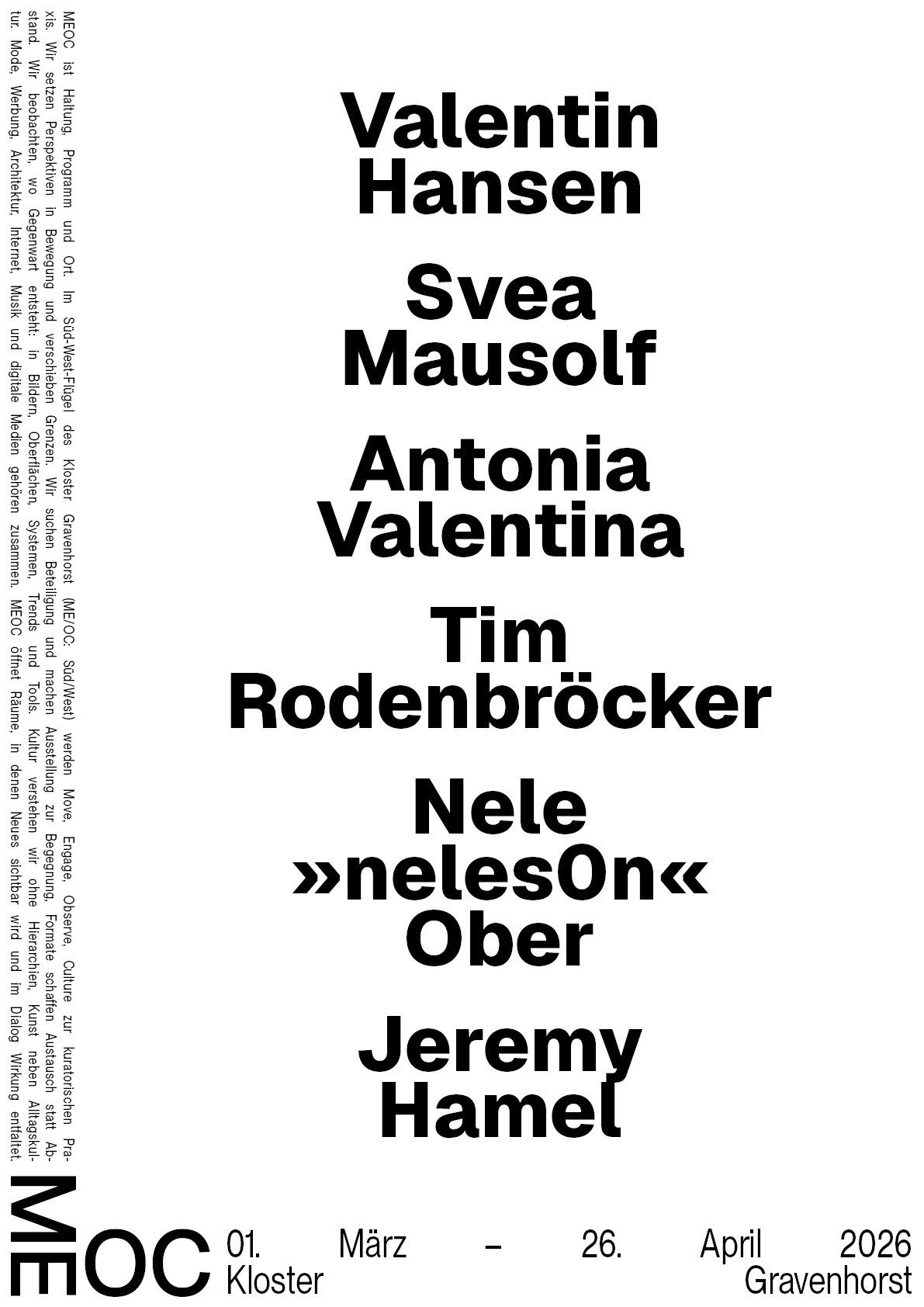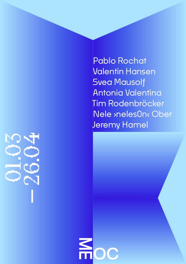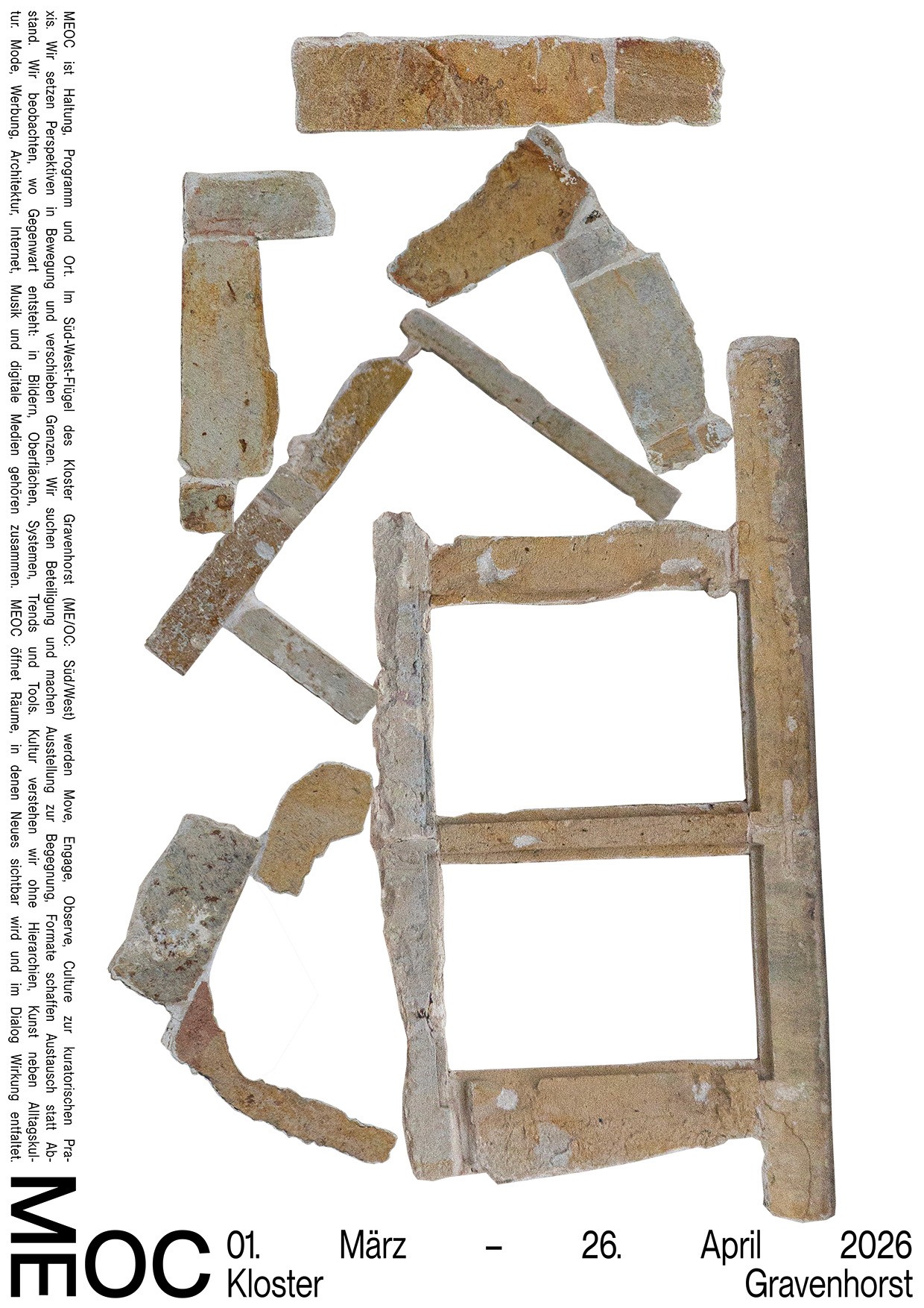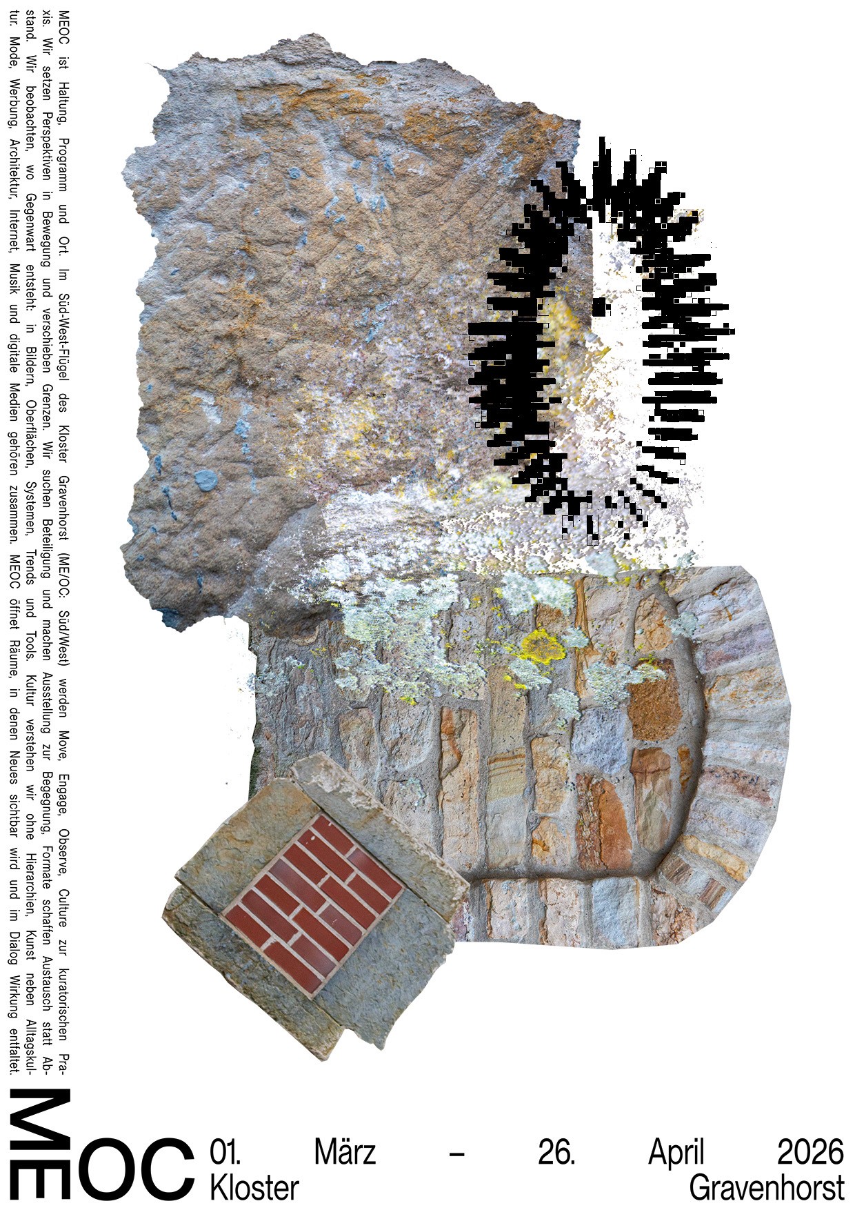 Die Namen und Logo Idee von MEOC für Latein Süd/West und als Akronym für das Leitmotiv »Move Engage Observe Culture« fand ich sehr stark und wollte ich unbedingt weiter ausarbeiten. Nachdem ich versuchte das Logo weiterzuentwickeln merkte ich, dass die Reduzierung auf das wesentliche die beste Entscheidung ist. Die im 90° aufeinander treffende Glyphen paare sagte eigentlich schon alles was gesagt werden musste. Die bloße Anordnung der Schrift in diesem Winkel erinnerte mich wieder zurück an die Schriftbänder an den Außenkanten der Grabplatten. Dabei kam mir die Idee ausgehend von dem Logo, Textabsätze in der jeweiligen Orientierung der Glyphen paare an den kompletten Außenkanten des Formats entlang zu setzten. Das Logo Bindeglied und Ausgangspunkt zugleich, trotzdem übernahm es dem Raum nicht Visuell, sondern eröffnete eine völlig neue, prägnant gerahmte Spielfläche.