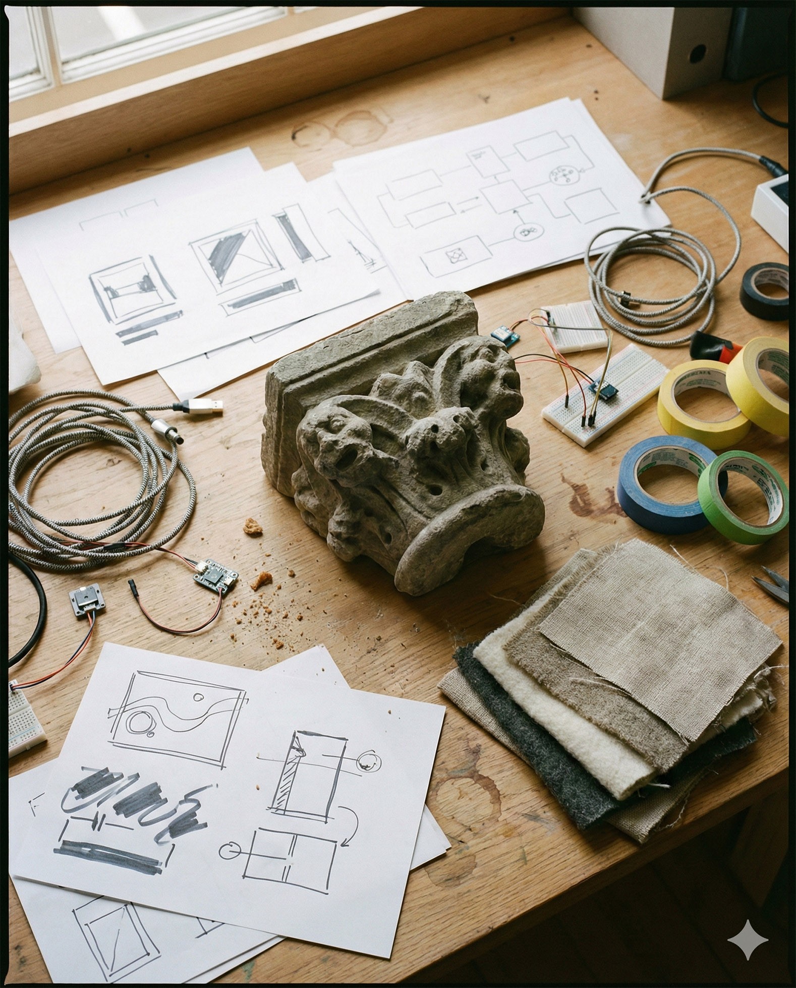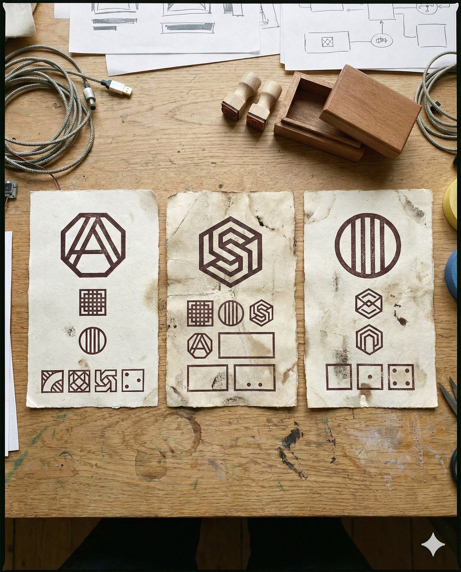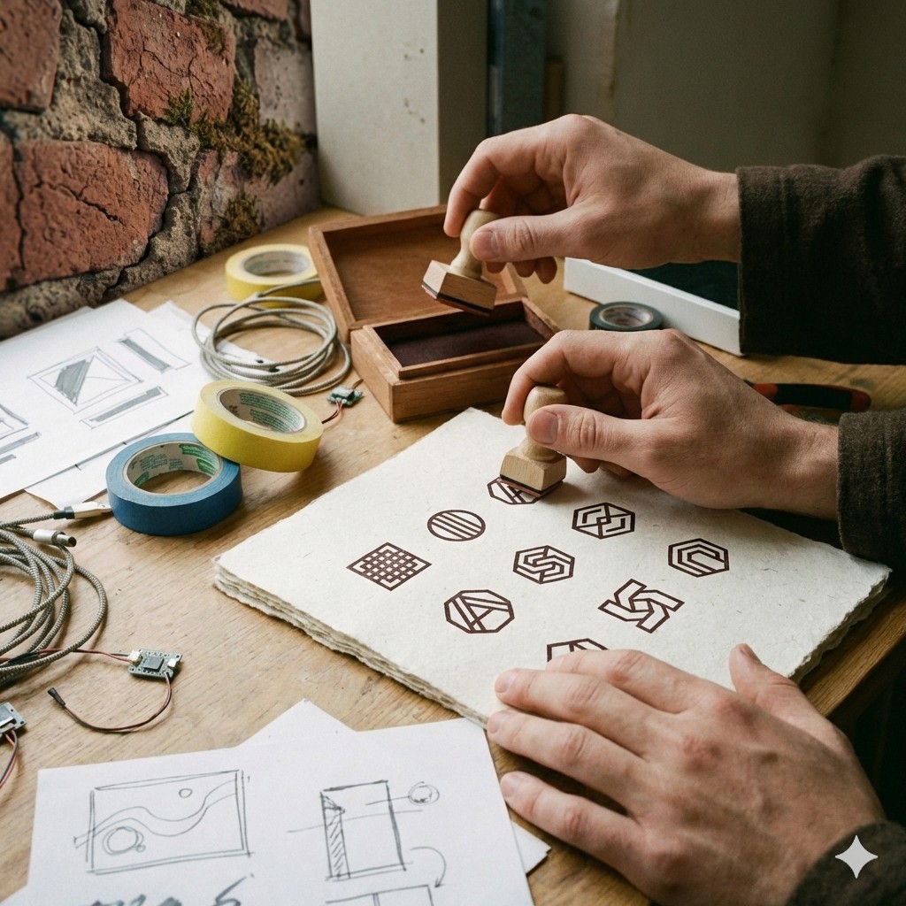 Erzeuge eine dokumentarische Szene (fotorealistisch) eines ‚Stempelrituals‘: Hände stempeln Tokens auf dickes Papier, daneben Werkstattmaterial (Skizzen, Tape, Kabel), im Hintergrund subtile Stein-/Kloster-Anmutung. Fokus auf Haptik und Ritual, nicht auf Menschenporträts. Die Siegel sind klar sichtbar, aber ohne Text. Farbwelt warm, natürlich, nicht werblich.
