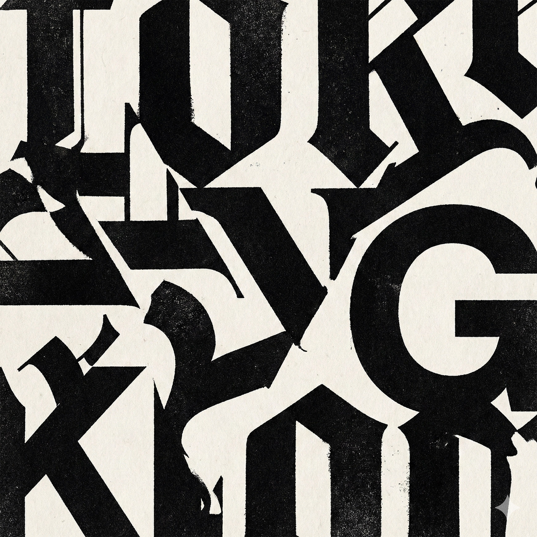 Erzeuge 8 Kompositionsstudien: abstrakte Typo-Formfragmente (gebrochen + modern) als große Negativraum-Formen, in die sehr kleine Signalzeichen (Dots/Bars/Rings) ‚eingehängt‘ sind. Ziel: Spannung aus Massivität und minimalem Puls. Nur Schwarz/Off-White + 1 Akzent. Keine Wörter.