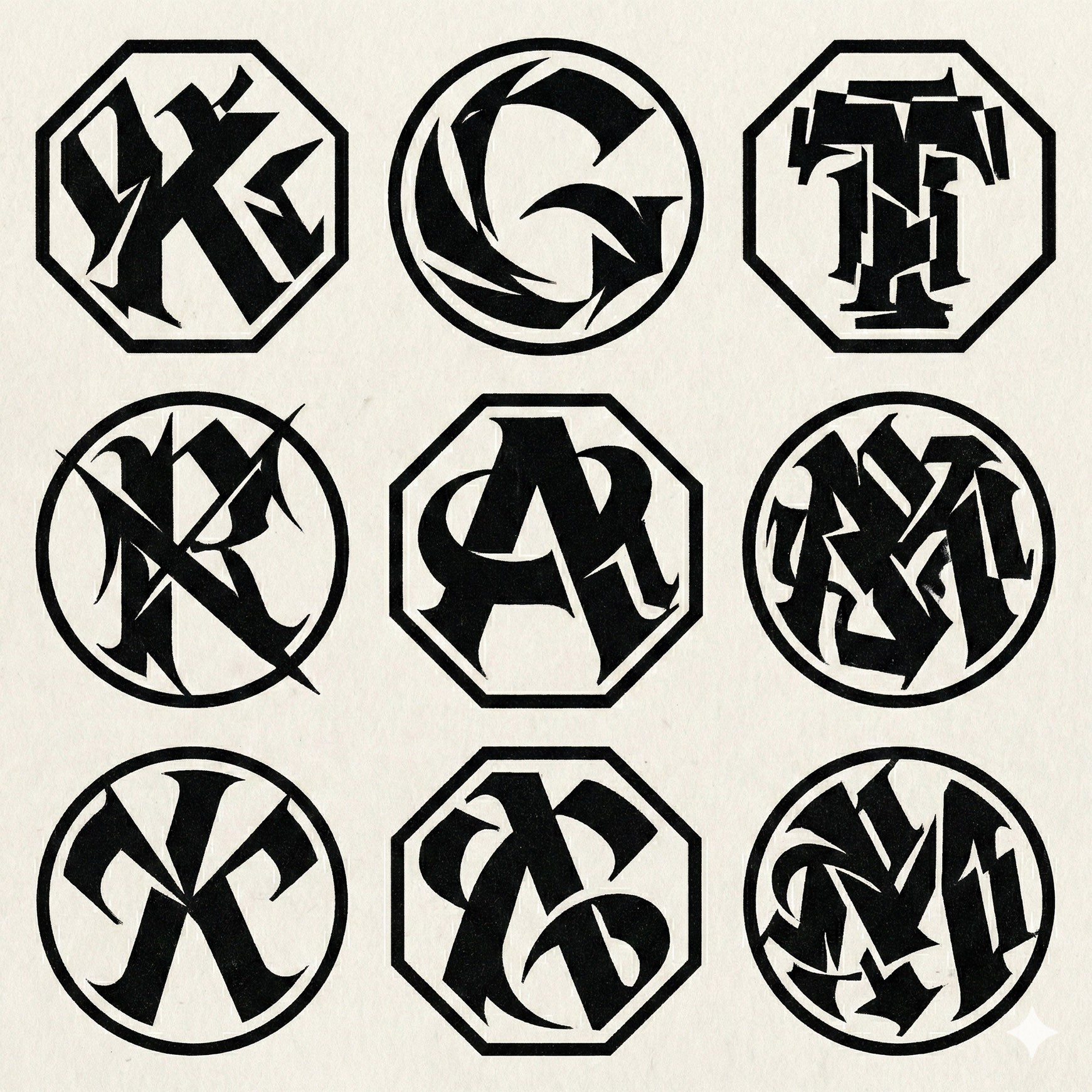 Erzeuge 6 Crest-/Monogramm-Studien: abstrakte Initial-ähnliche Formen aus Typo-Fragmenten, die innerhalb eines Siegel-Umrisses sitzen (Kreis/Oktagon). Keine lesbaren Buchstaben, nur formale Anmutung von ‚Orden/Archiv‘ trifft ‚Gegenwart‘. Einfarbig, sehr präzise, als Logo-Testsheet.